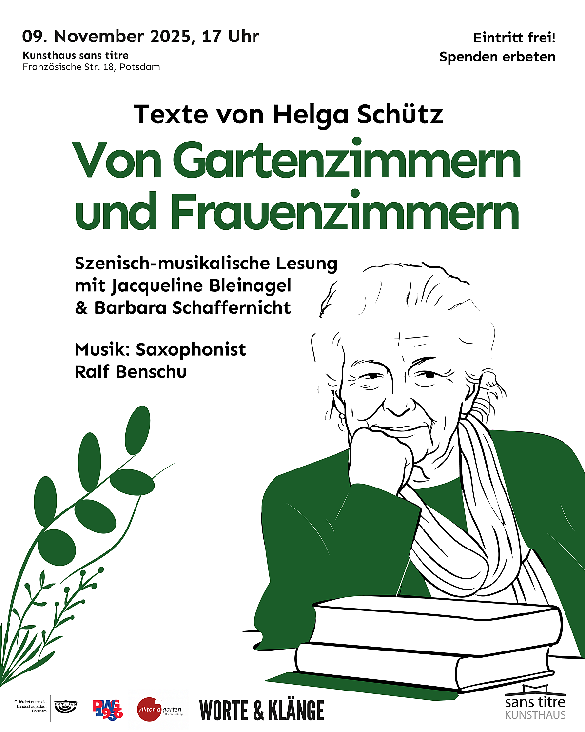 Im Kunsthaus sans titre in der Französischen Straße 18 finden am Sonntag, 9. November, zwei aufeinanderfolgende Kulturveranstaltungen statt. Um 16 Uhr endet die Gemeinschaftsausstellung „Zeichen Zur Zeit“ mit einer Finissage. Die Ausstellung setzt sich mit der Rolle von Schrift in der Kunst auseinander. Gezeigt werden Werke von Frauke Otto-Bartsch, Micha Brendel, Gerhild Ebel, Mona Höke, Axel Malik, Mikos Meininger, Katja Pudor, Christian Schellenberger, Julius Voigt, Joerg Waehner, Isabel Zuber und Klaus Zylla. Einige der Künstler werden vor Ort sein. Der Eintritt ist frei, Spenden sind möglich.