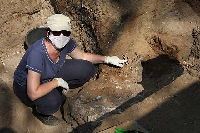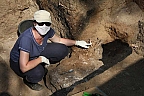 : Die Anthropologin Dr. Bettina Jungklaus legt 7.000 Jahre alte Menschenknochen an der mittesteinzeitlichen Fundstelle Groß Fredenwalde frei. Der Mundschutz soll die Kontamination der steinzeitlichen Überreste mit moderner DNA verhindern. Foto: BLDAM