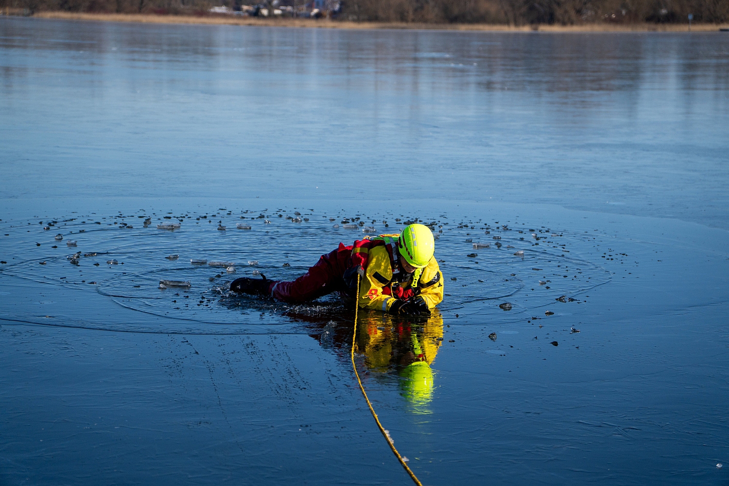 - Wenn du einen Menschen im Eis eingebrochen siehst, wähle direkt den Notruf (112) oder organisiere, dass jemand den Notruf wählt!