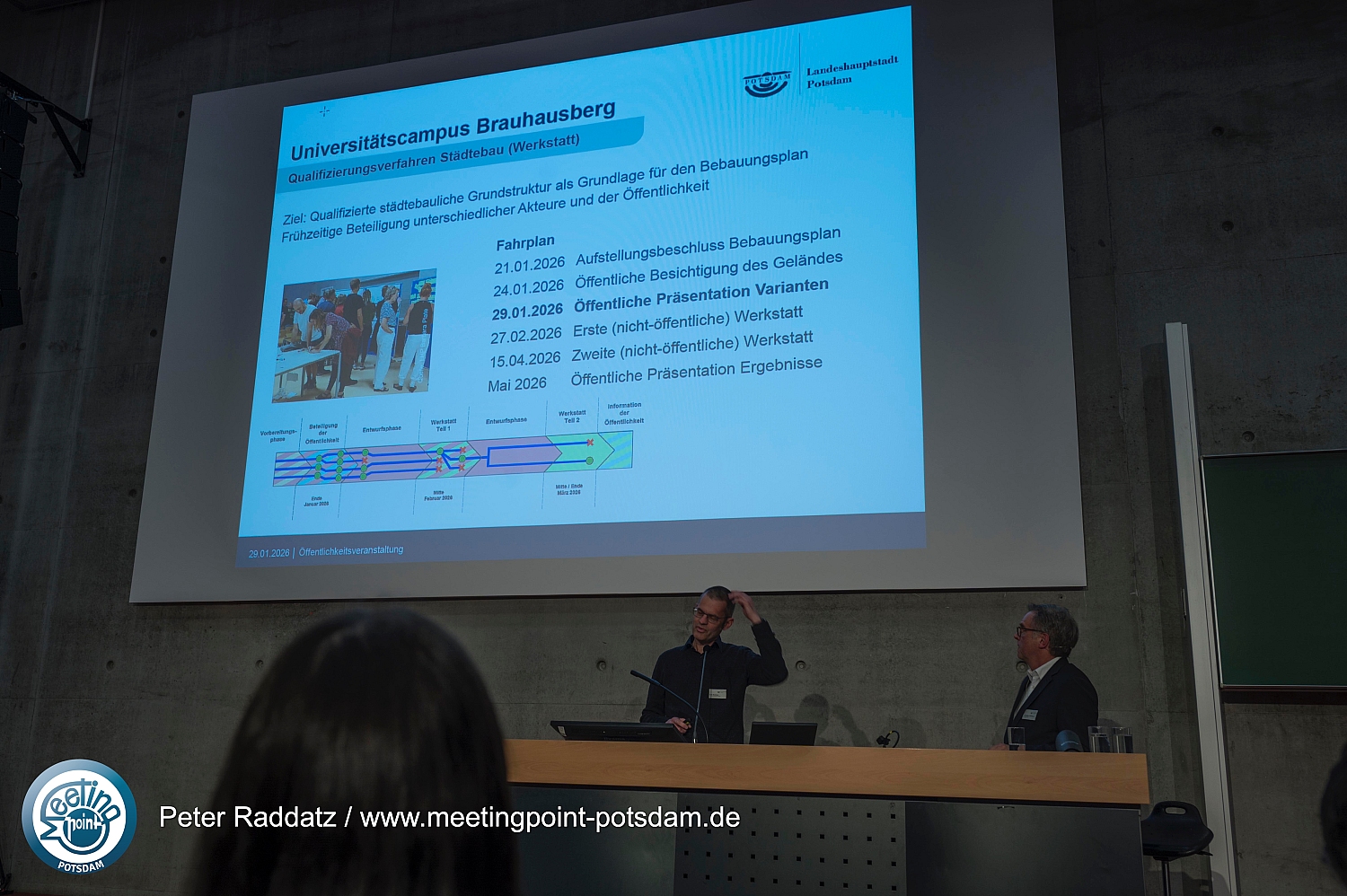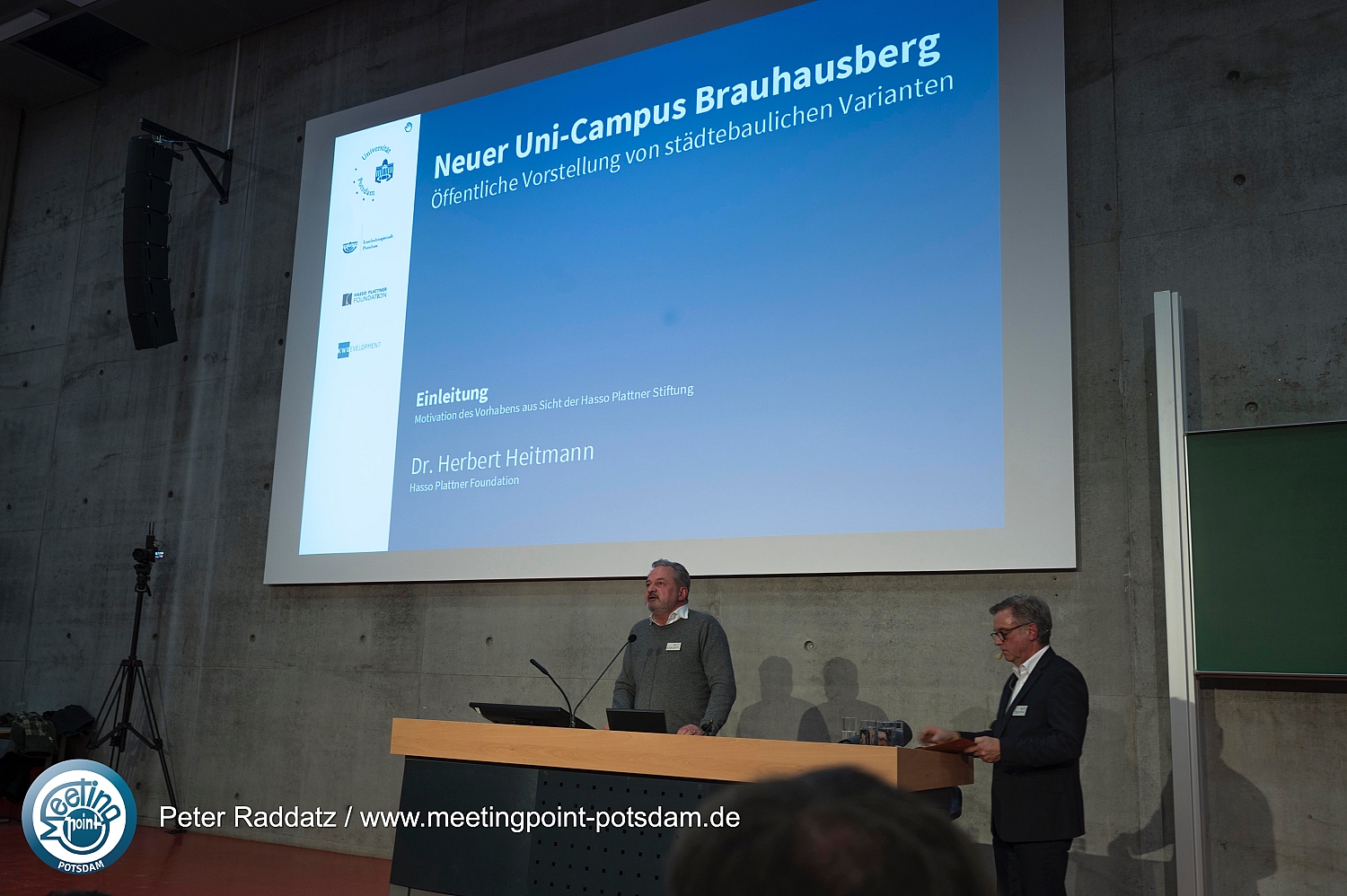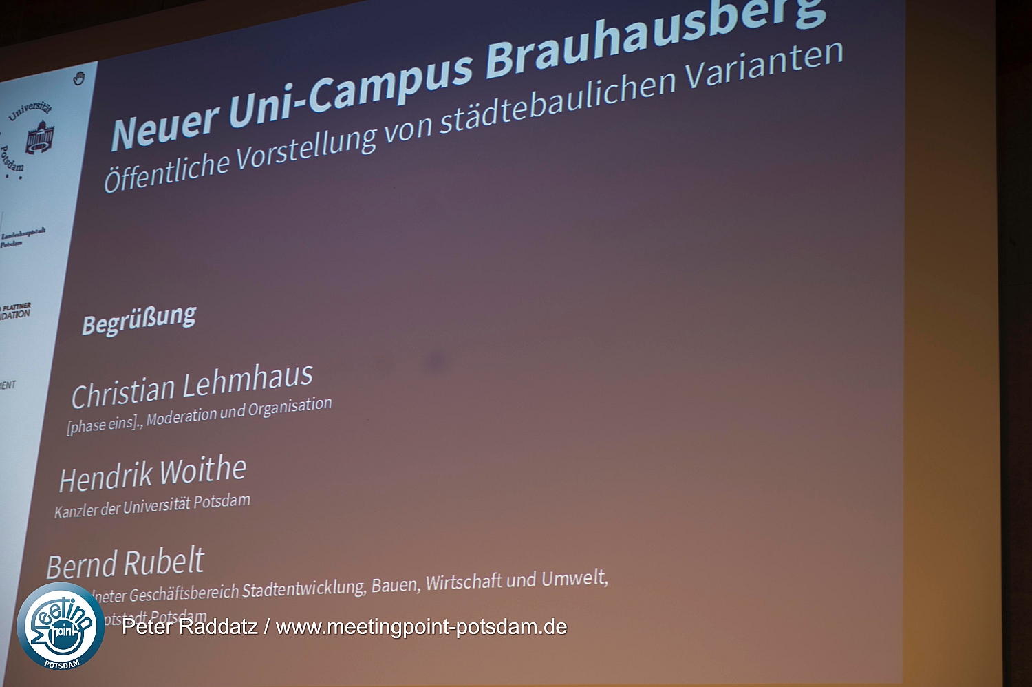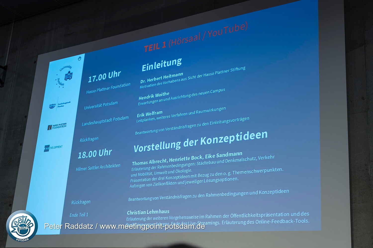 Die Vorstellung fand auf dem Campus Griebnitzsee statt. Vertreter der Universität Potsdam, der Hasso Plattner Foundation und der Landeshauptstadt Potsdam erläuterten zunächst Projektziele und planungsrechtliche Rahmenbedingungen. Anschließend präsentierte das Architekturbüro Hilmer Sattler Architekten mehrere städtebauliche Planvarianten.