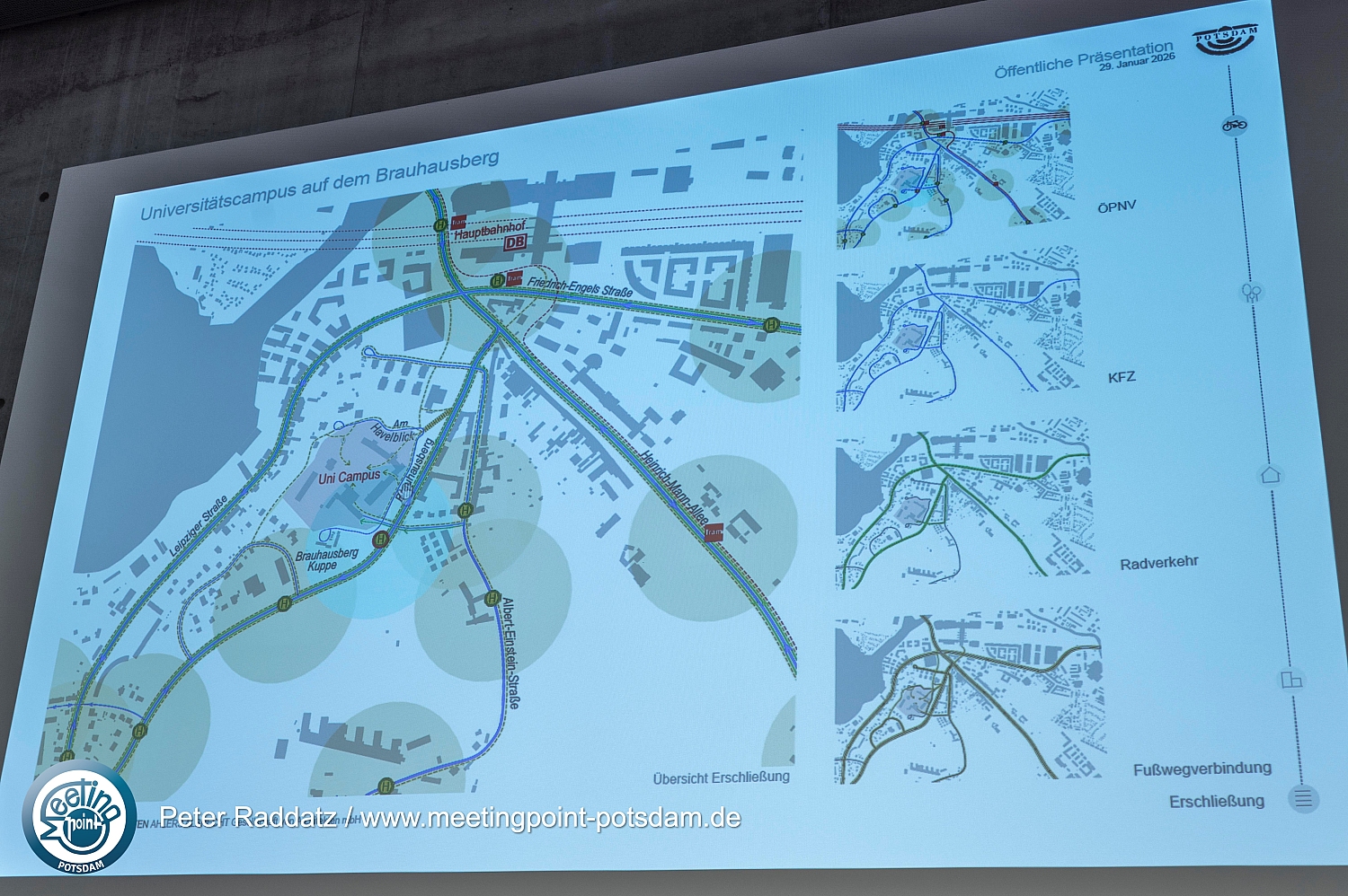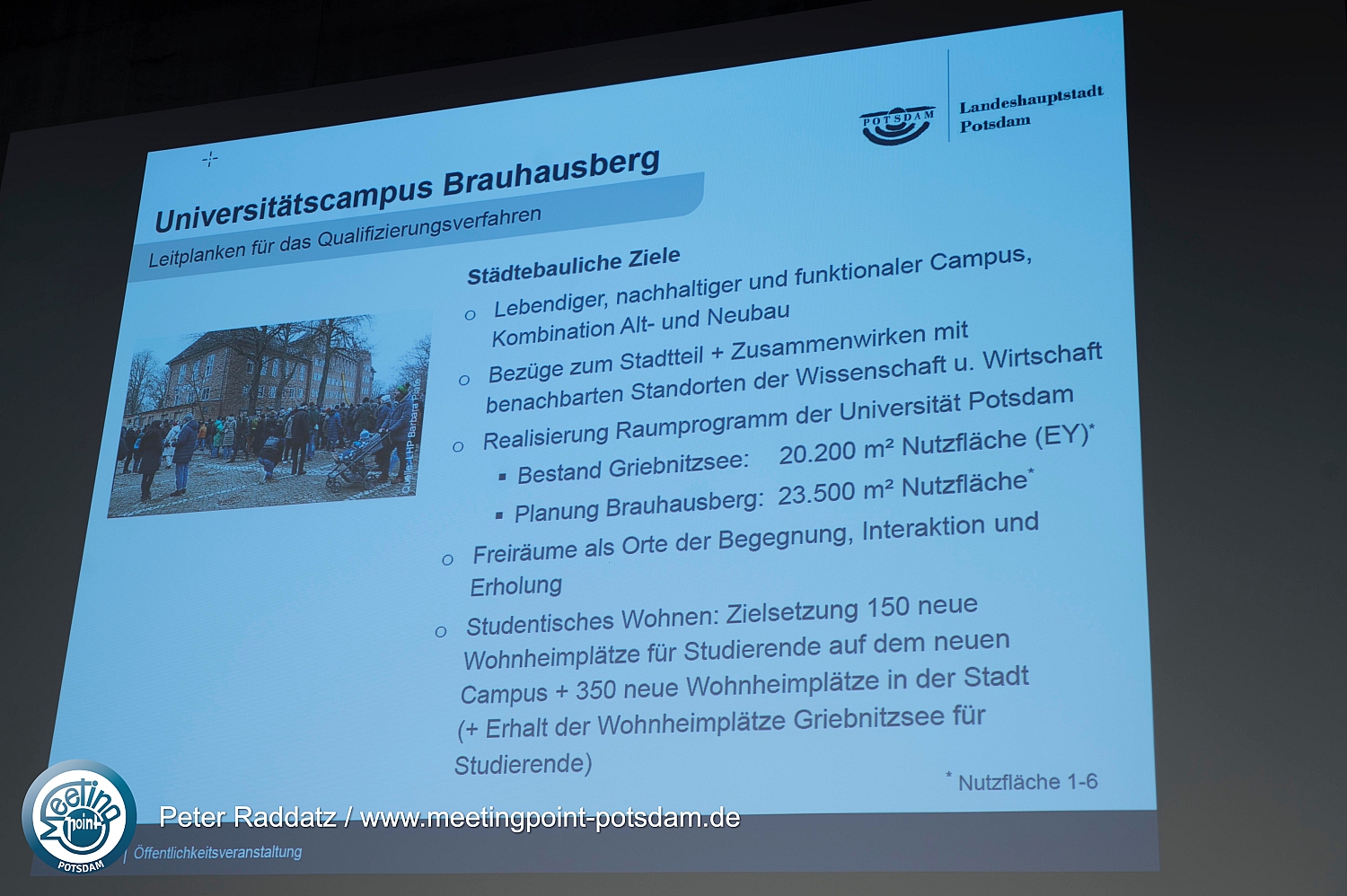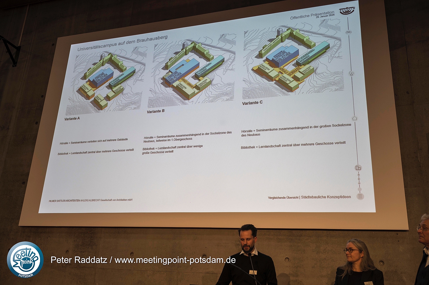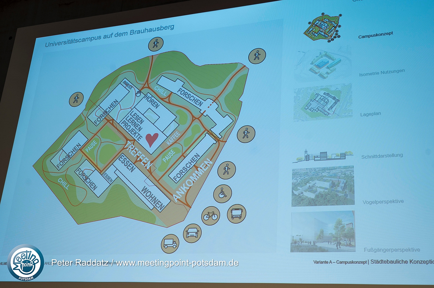 Rund 400 Interessierte haben sich jüngst bei einer öffentlichen Veranstaltung über die städtebaulichen Varianten für den Brauhausberg informiert. Auf dem Areal soll in den kommenden Jahren ein öffentlicher Universitätscampus entstehen. Grundlage ist eine Kooperationsvereinbarung zwischen dem Land Brandenburg, der Universität Potsdam und der Hasso Plattner Foundation, die neben dem Neubau auf dem Brauhausberg auch weitere Universitätsstandorte umfasst.