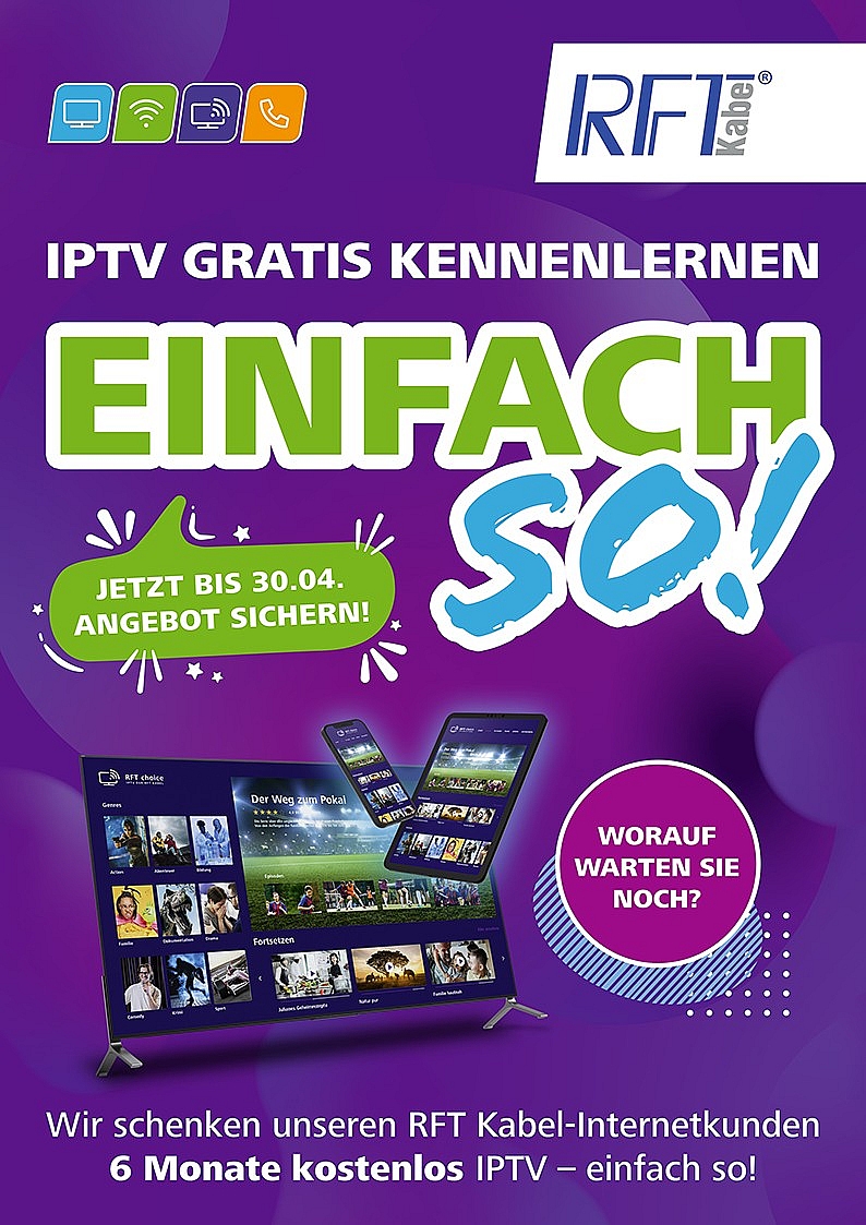 RFT Kabel startet eine Aktion für alle Brandenburger im Versorgungsgebiet. Mit der Aktion „Einfach so: IPTV kennenlernen – mit RFT choice light“ können Internetkunden von RFT Kabel (langjährige oder neue Kunden mit einem aktivem Internetanschluss) IPTV 6 Monate kostenfrei testen.