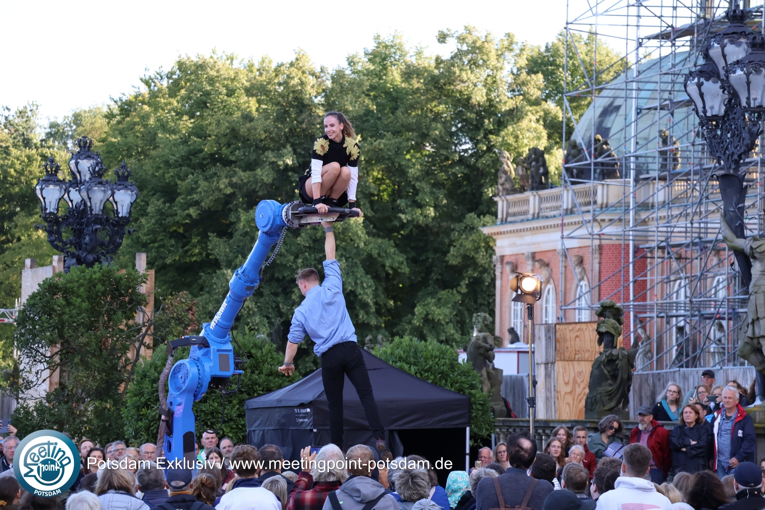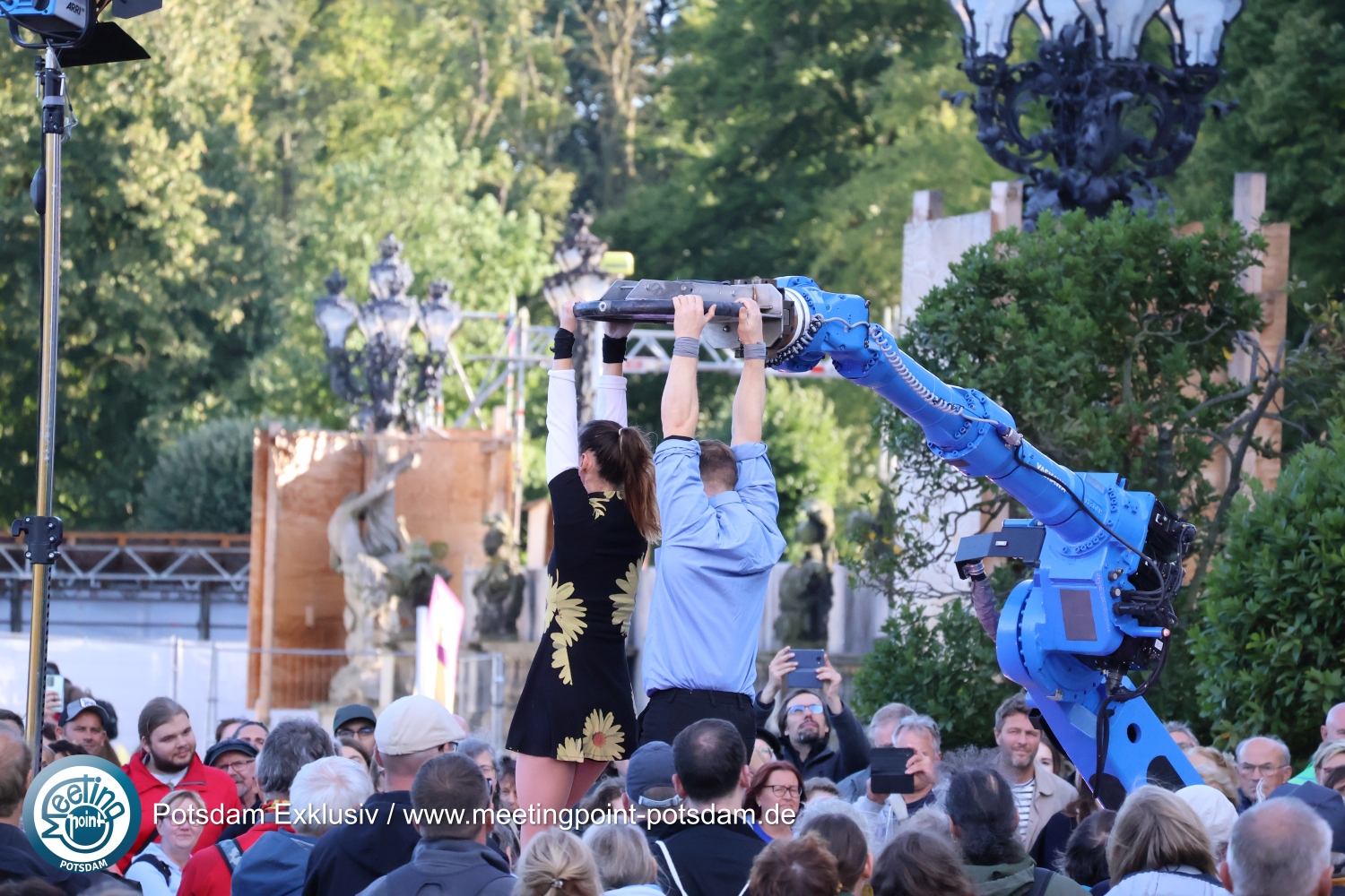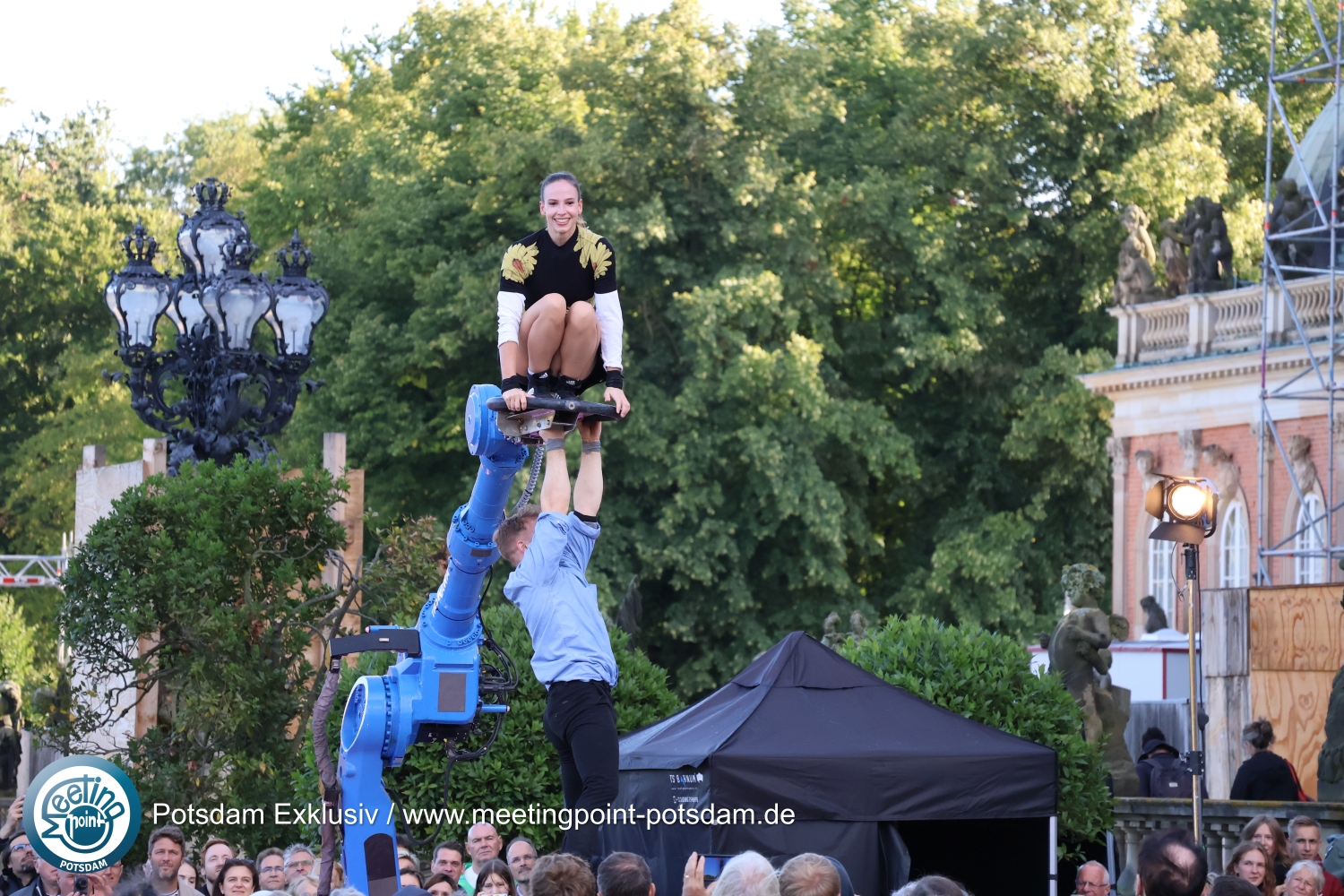 Vor der malerischen Kulisse des eingerüsteten Neuen Palais kam es zudem zu einem faszinierenden Zusammenspiel zwischen Mann und Frau, Mensch und Maschine: UliK Robotic zeigten Akrobatik an einem Roboterarm.
