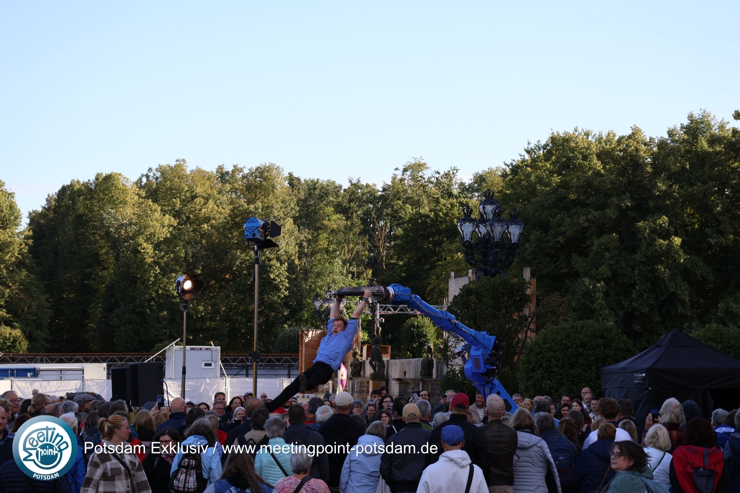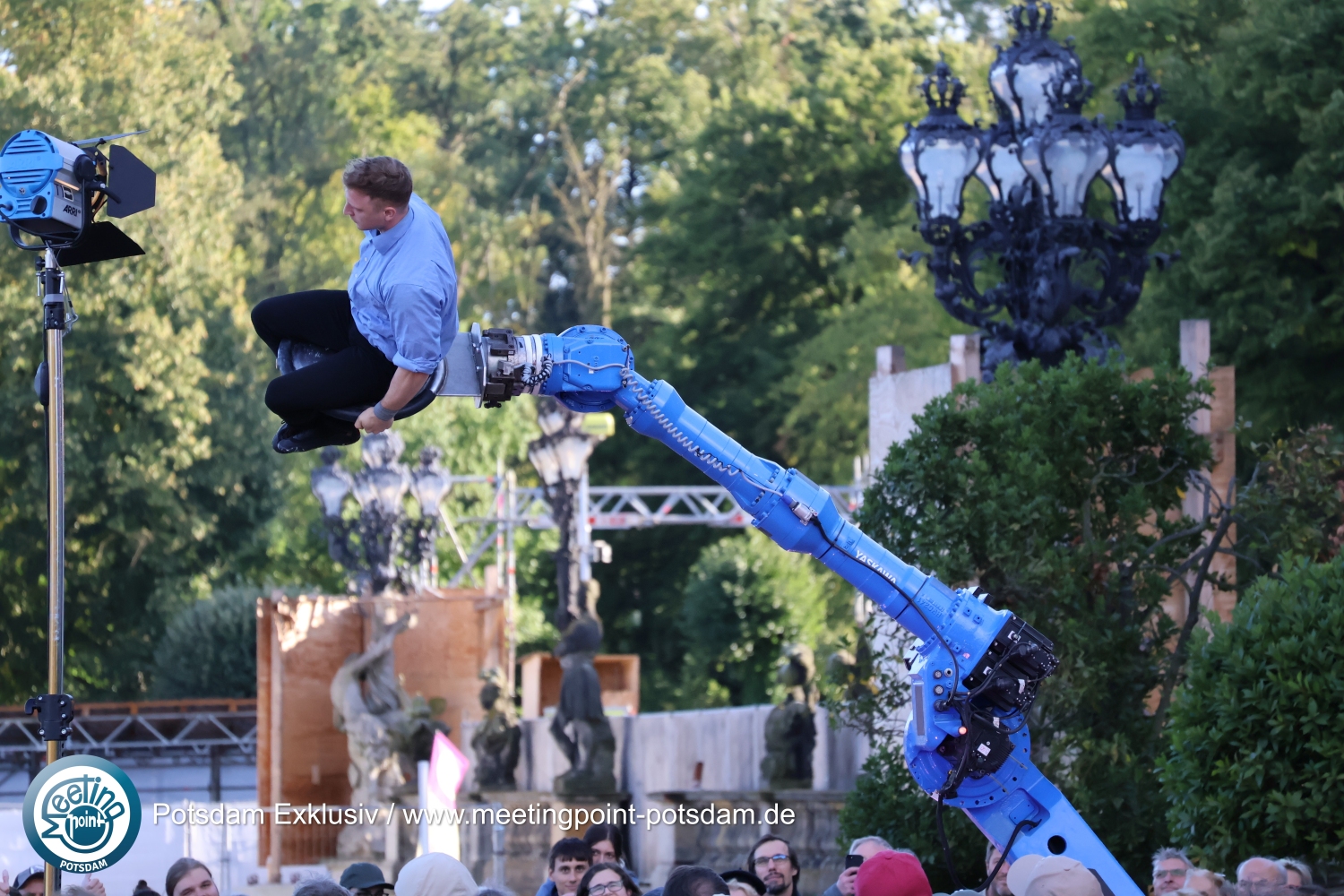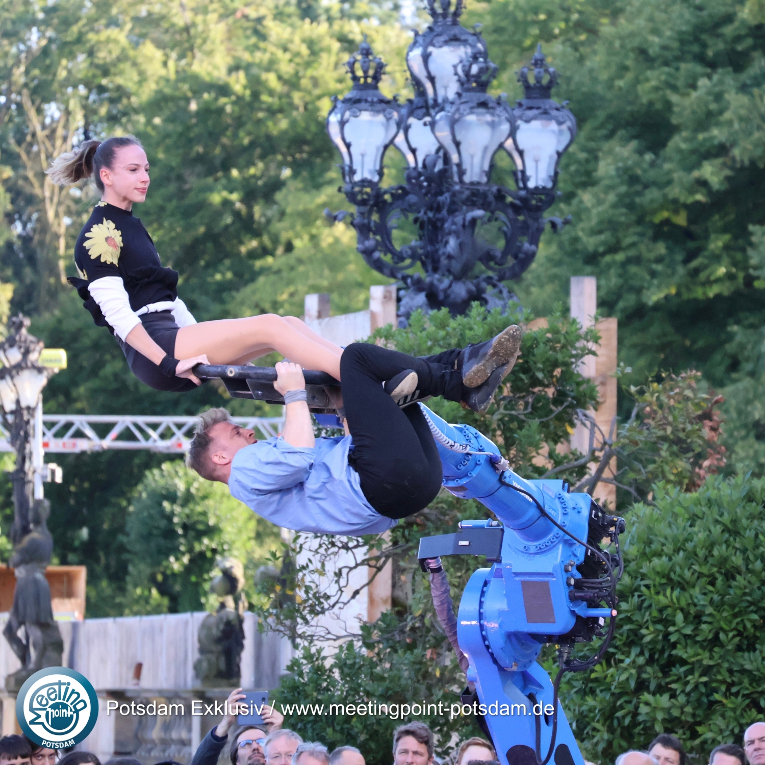 Vor der malerischen Kulisse des eingerüsteten Neuen Palais kam es zudem zu einem faszinierenden Zusammenspiel zwischen Mann und Frau, Mensch und Maschine: UliK Robotic zeigten Akrobatik an einem Roboterarm.