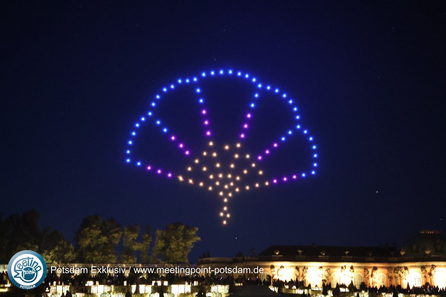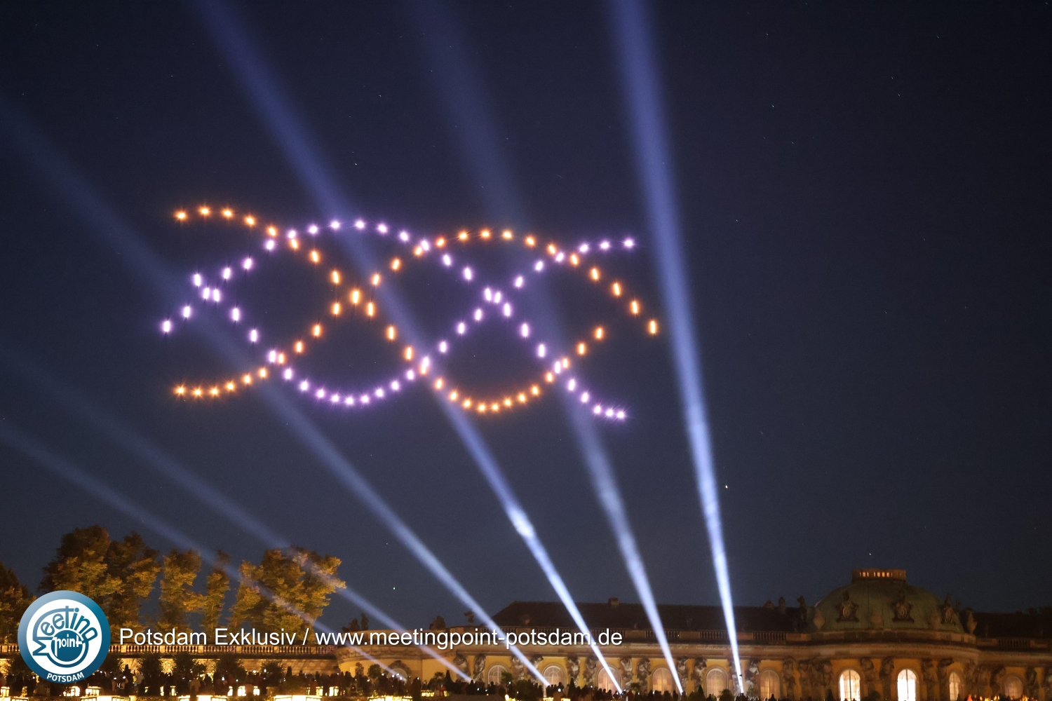 Ein besonderes Highlight - hoch in der Luft und mit viel Licht - war die Drohnenshow. Der Komponist und Medienkünstler Lukas Taido hat mit „Air“ eigens für die diesjährige Potsdamer Schlössernacht eine spektakuläre Inszenierung entworfen. In luftiger Höhe über den Dächern von Schloss Sanssouci schwebten, wie von Geisterhand bewegt, hundert farbige LED-Lichter, kombiniert mit weit in den Nachthimmel ragenden Lichtsäulen. Sie erzählten in tänzerischen Traumbildern von Ereignissen und Persönlichkeiten aus der Potsdamer Blütezeit des Barock.