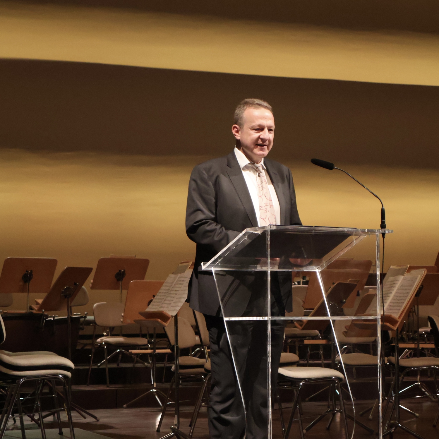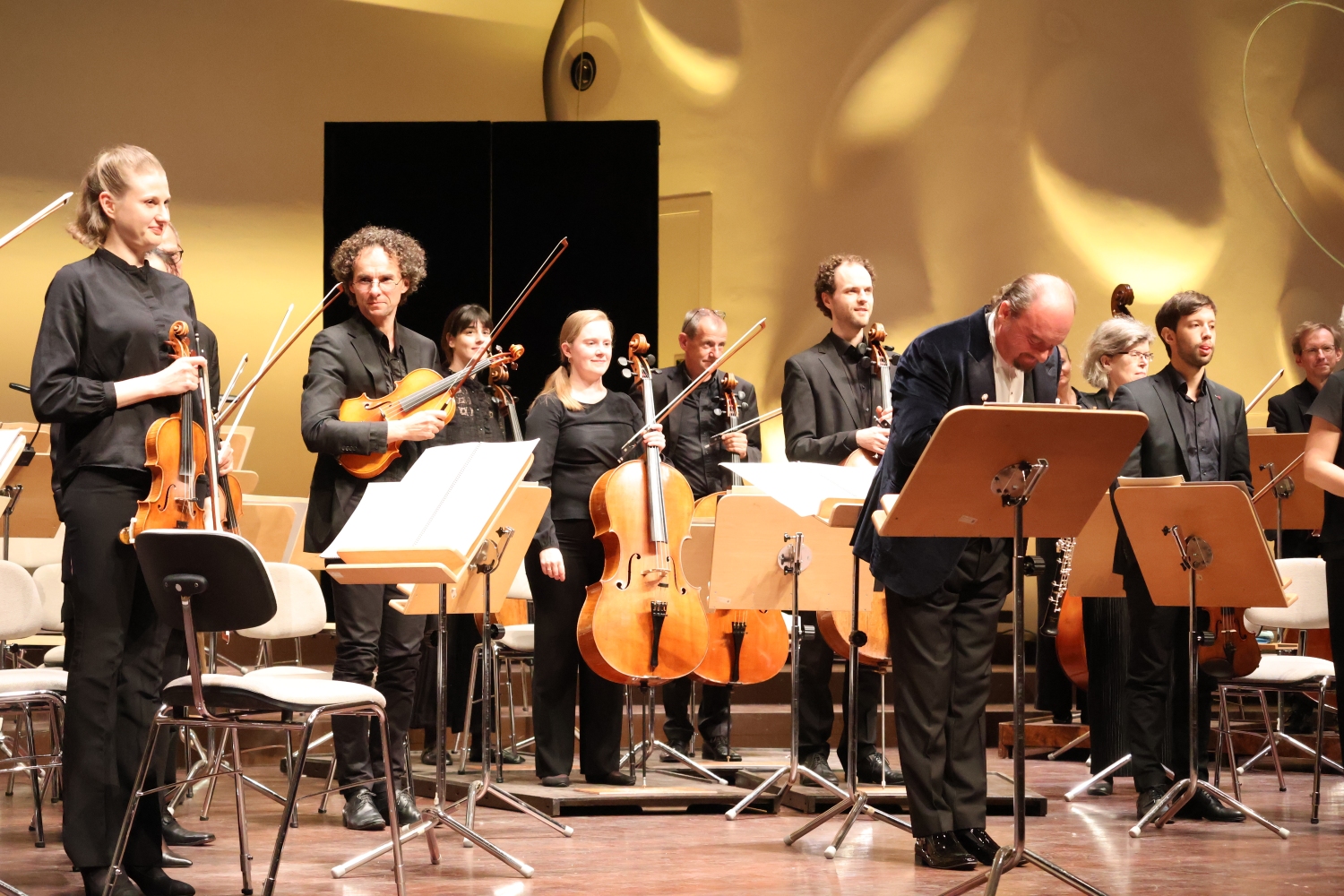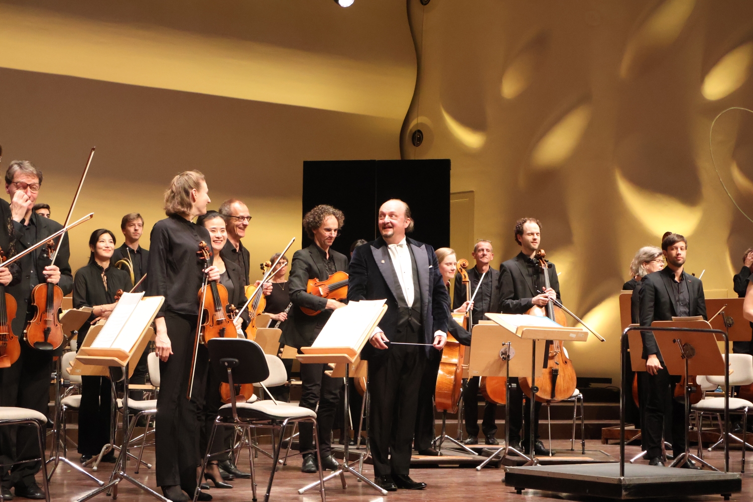 Danach folgte ein weiteres Stück des Gegenwartskomponisten Nicolas Bacri (1961*): die Sinfonie Nr. 4. In vier Sätzen nimmt das Werk Anklänge von Johann Strauss, Igor Strawinsky, Arnold Schönberg und Kurt Weil - eine musikalische Zeitreise! Tosender Applaus und offenes Staunen in den Gesichtern des Publikums angesichts dieses kraftvollen Werkes. Da ließ es sich auch der Komponist Nicolas Bacri nicht nehmen, aus den Zuschauerreihen zu kommen und dem Dirigenten zu gratulieren.