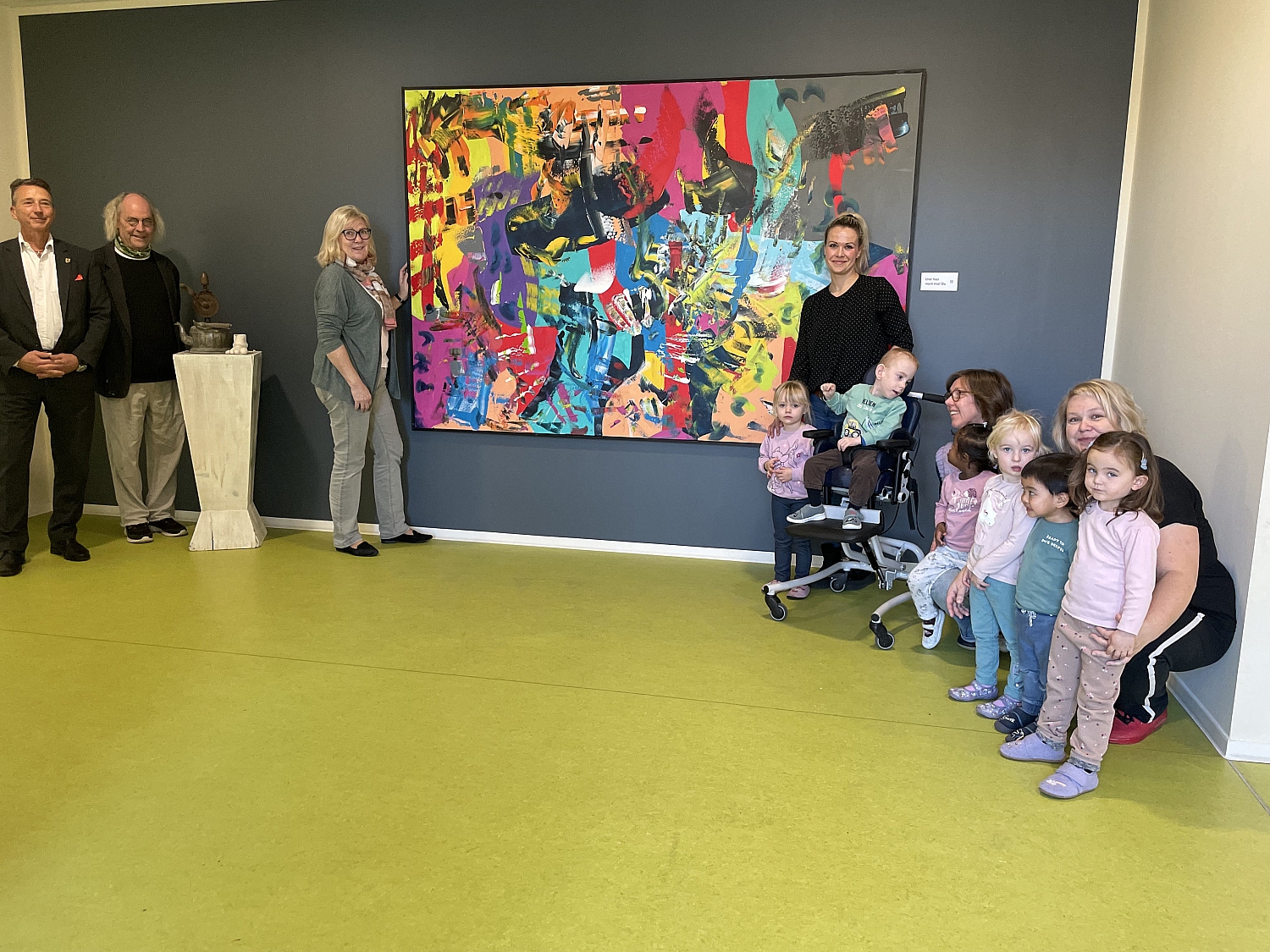 Weymann erläuterte, dass ursprünglich beide Bilder in den Aufenthaltsräumen der Erzieher vorgesehen waren, sich die Einrichtungen jedoch wünschten, die Kunst für Kinder und Eltern sichtbar zu machen. „Das hat mich sehr berührt“, sagte er.