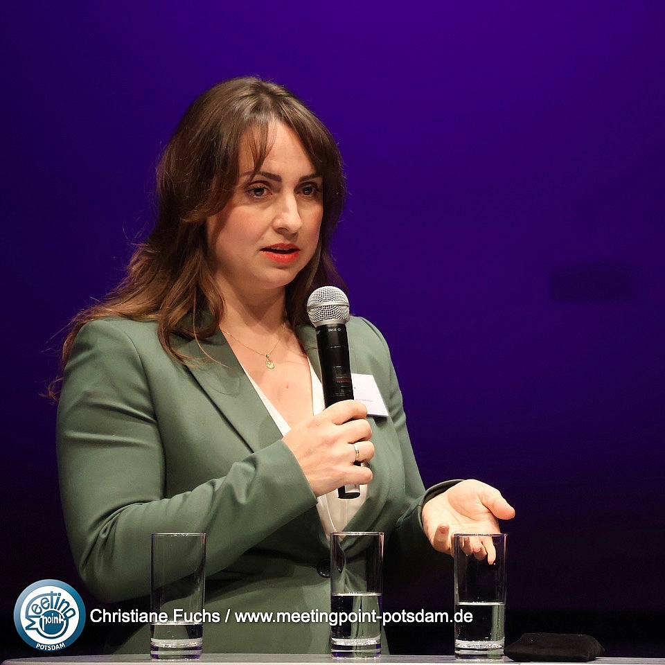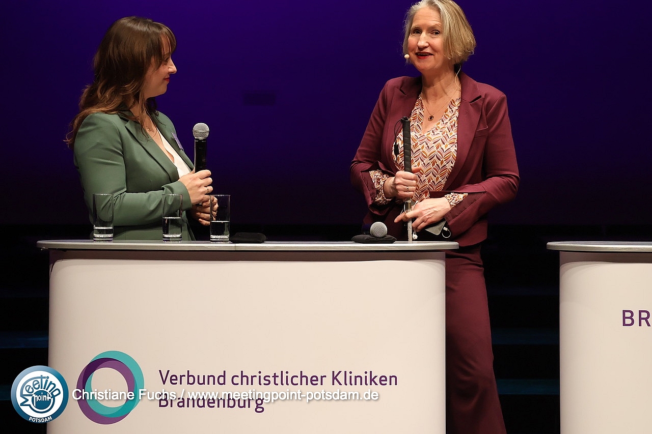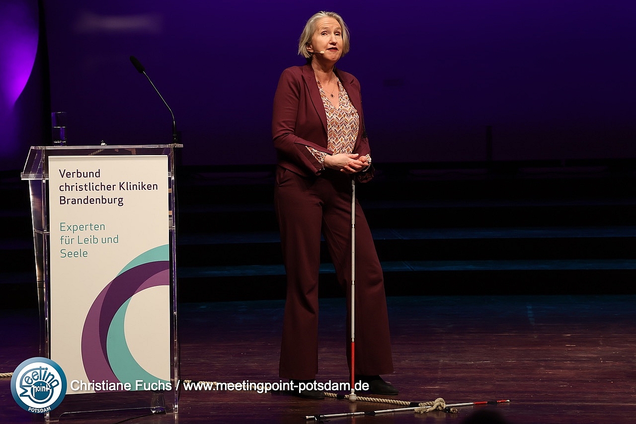 Interdisziplinäre Zusammenarbeit und TeilhabeIm Anschluß übernahm Dörte Maack das Bühnengeschehen. Mit einem Poetry Slam zu den Herausforderungen der Gesundheitsbranche schuf die Moderatorin sofort Aufmerksamkeit und Nähe.