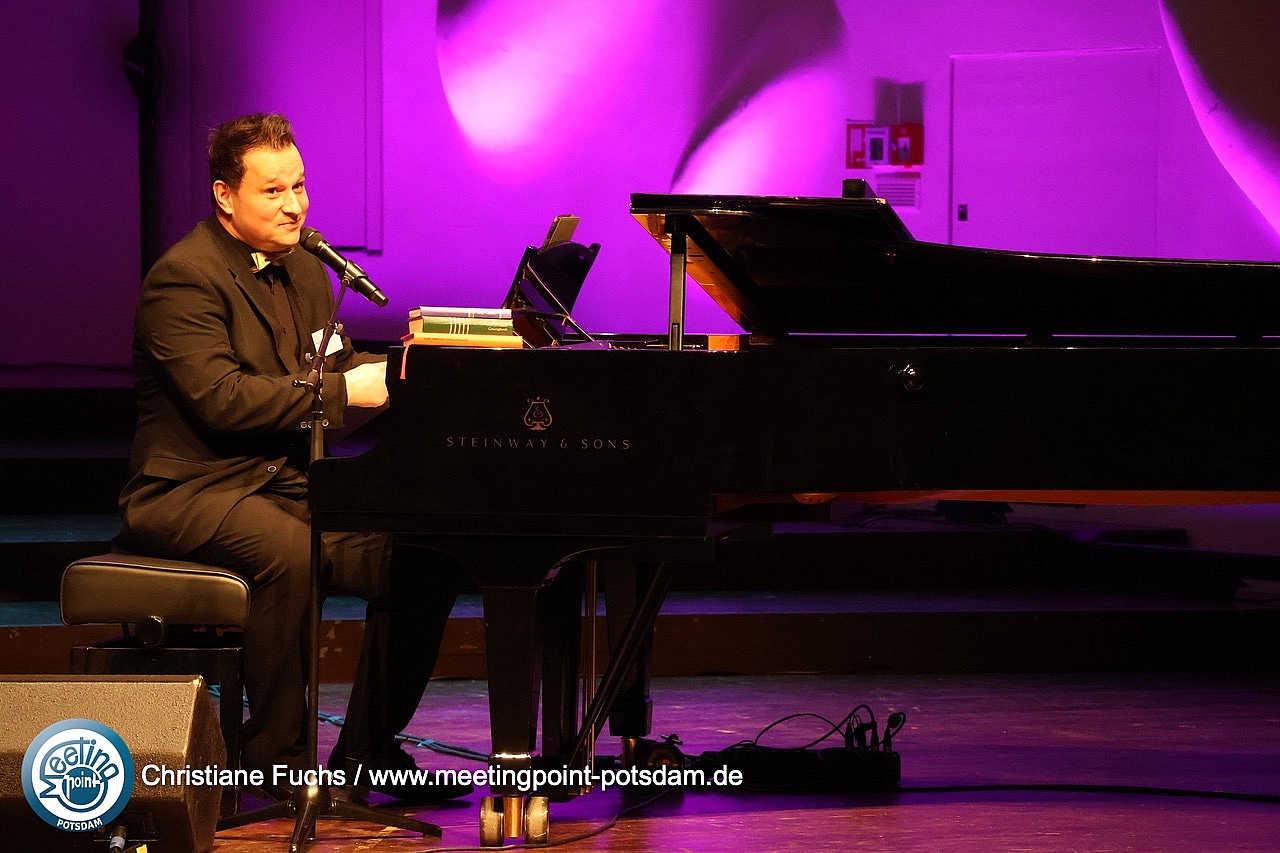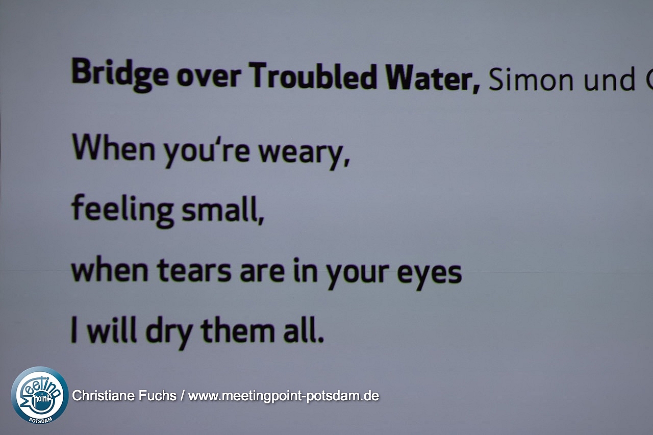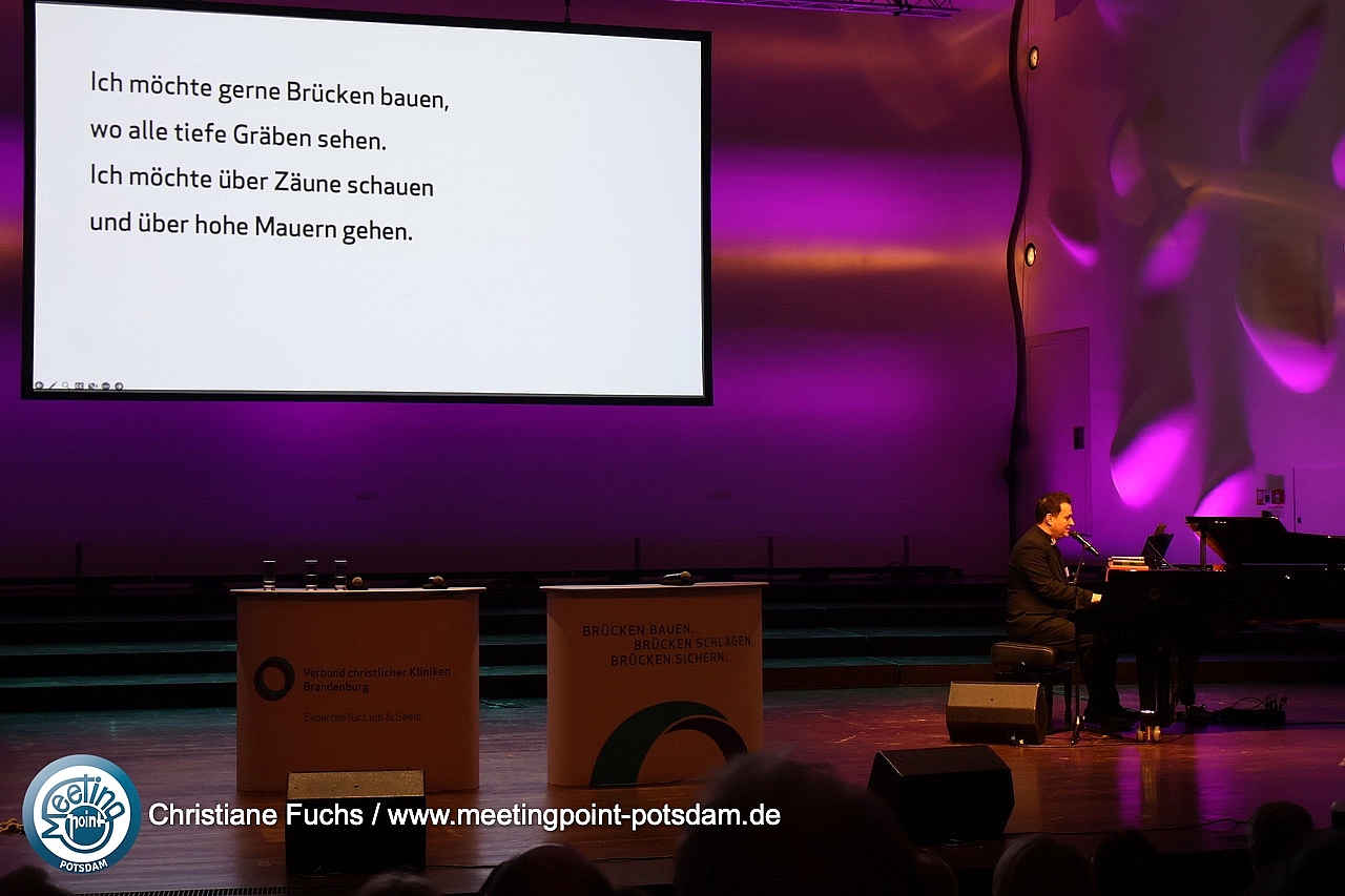 Für die musikalische Begleitung sorgte Pianist Martin Hunger aus Potsdam. Mit drei Songs rund um das Motiv der Brücke – darunter natürlich „Über sieben Brücken musst du gehn“ von Karat – lud er das Publikum zum Mitsingen ein. Der Text an der Wand machte es leicht, gemeinsam den Bogen zum Motto des Abends zu schlagen.