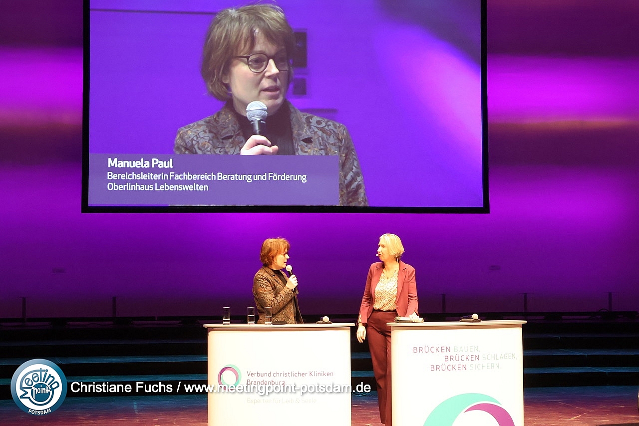 Das Bühnenprogramm zeigte drei Videoeinspieler, die unter dem Motto „Brücken bauen“ darlegten, wie in den Verbundhäusern interdisziplinär zusammen gearbeitet wird, wie Teilhabe gelingen kann und wie auch in der brandenburgisch-polnischen Grenzregion Gesundheitsbrücken geschlagen werden.