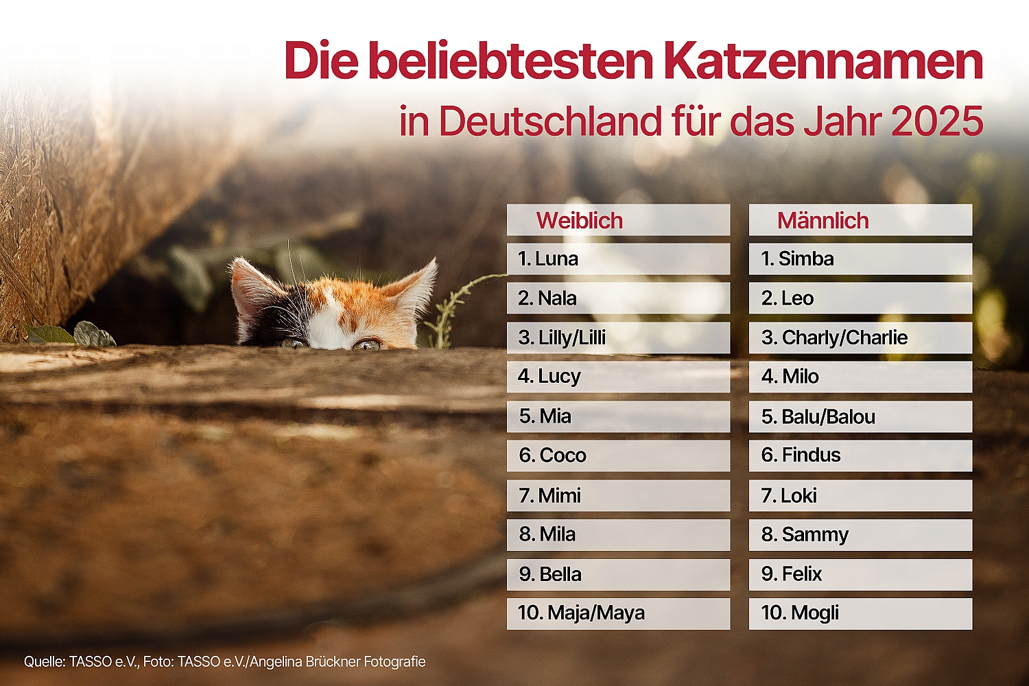 Grundlage der Auswertung sind alle Tiere, die zwischen dem 1. Januar und dem 31. Dezember 2025 neu bei TASSO in Deutschland registriert wurden. Die Analyse zeigt, dass sich Namenstrends über Jahre hinweg halten. TASSO-Leiter Philip McCreight ordnet ein: „Namen wie Mikesch, Blacky oder Susi sind schon lange nicht mehr aktuell. Stattdessen dominieren sowohl bei den Hunden als auch bei den Katzen beliebte Mädchen- und Jungennamen, Disney-Klassiker und diese eine römische Mondgöttin. Luna hält sich bei den Hündinnen seit mehr als zehn Jahren auf Platz eins. Bei den Katzendamen sind es mittlerweile sechs Jahre in Folge.“